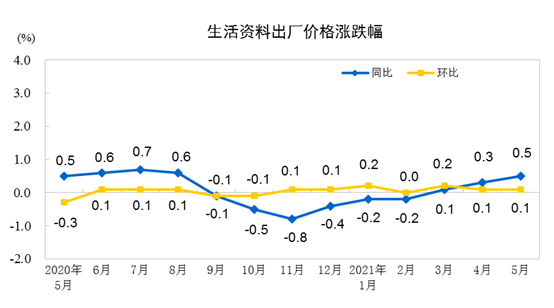 2021年5月份,全国居民消费价格同比上涨1.3%。其中,城市上涨1.4%,农村上涨1.1%;食品价格上涨0.3%,非食品价格上涨1.6%;消费品价格上涨1.6%,服务价格上涨0.9%。1­­—5月平均,全国居民消费价格比去年同期上涨0.4%。