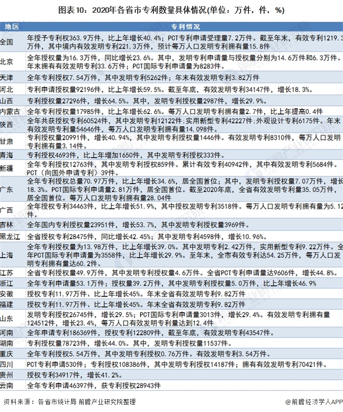 地区方面,2020年广东省专利授权总量70.97万件,比上年增长34.6%,居全国首位;其中,发明专利授权量7.07万件,增长18.3%。全年《专利合作条约》PCT国际专利申请量2.81万件,居全国首位。截至2020年底,全省有效发明专利量35.05万件,居全国首位。每万人口发明专利拥有量28.04件,远高于全国平均水平。