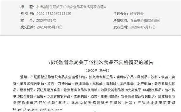 去年5月12日,市场监管总局发布关于19批次食品不合格情况的通告(2020年第9号)显示,市场监管总局对粮食加工品、食用农产品、水产制品等重点食品组织安全监督抽检。在全国抽检19大类食品1014批次样品。抽样检验项目合格样品995批次,不合格样品19批次。不合格样品涉及食用农产品、水果制品、酒类。主要问题是,农兽药残留超标16批次,质量指标与标签标示值不符的问题2批次,食品添加剂超限量使用问题1批次。