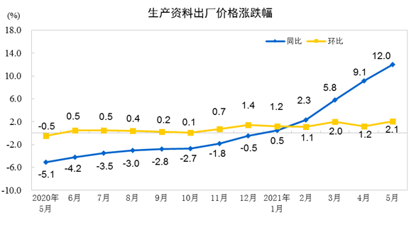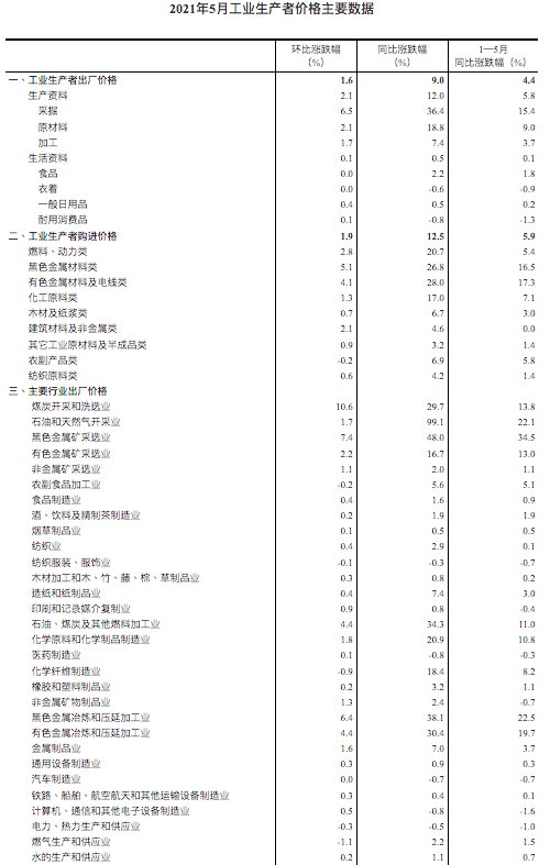2021年5月份,全国工业生产者出厂价格同比上涨9.0%,环比上涨1.6%;工业生产者购进价格同比上涨12.5%,环比上涨1.9%。1—5月平均,工业生产者出厂价格比去年同期上涨4.4%,工业生产者购进价格上涨5.9%。