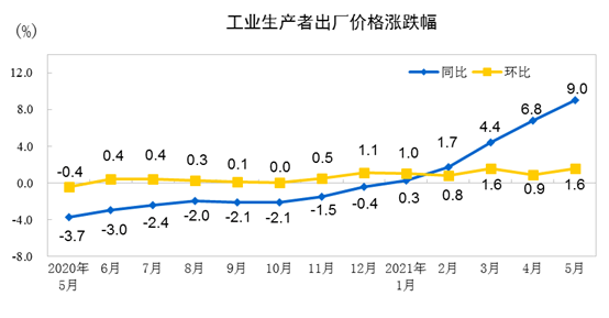 (原标题:中国5月PPI同比上涨9% 涨幅为2008年以来最高 CPI涨1.3%)