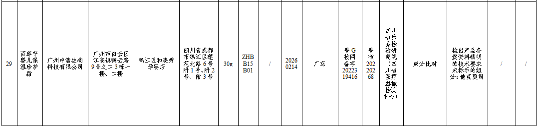 “不合格名单”显示,由科丽思化妆品(上海)有限公司生产的“朵望肃勄特护膏”检测出《化妆品禁用原料目录》明确禁止添加的丙烯酰胺、广州中浩生物科技有限公司生产的“百萃宁婴儿保湿珍护霜”检测出禁用的抗生素他克莫司。