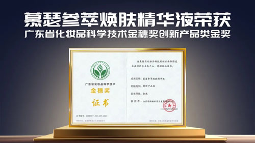 近日,由广东省化妆品科学技术研究会主办的第九届化妆品科技节在广州越秀国际会议中心盛大启幕,安然公司慕瑟参萃焕肤精华液凭借突破性的创新技术,从众多竞品中脱颖而出,荣获广东省化妆品科学技术金穗奖创新产品类金奖。