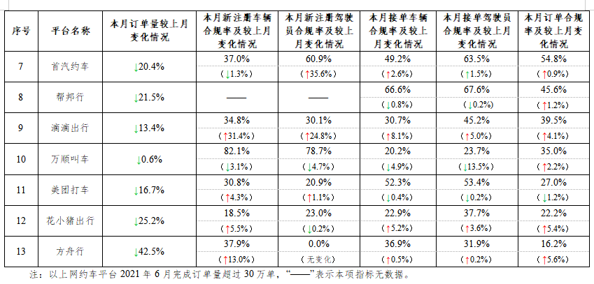 一方面,在订单量超过30万单的网约车平台中,如祺出行的订单合规率最高,垫底的是方舟行。