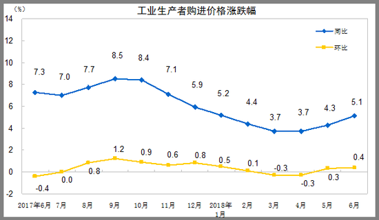 2018年6月份,全国工业生产者出厂价格同比上涨4.7%,环比上涨0.3%。工业生产者购进价格同比上涨5.1%,环比上涨0.4%。上半年,工业生产者出厂价格比去年同期上涨3.9%,工业生产者购进价格上涨4.4%。